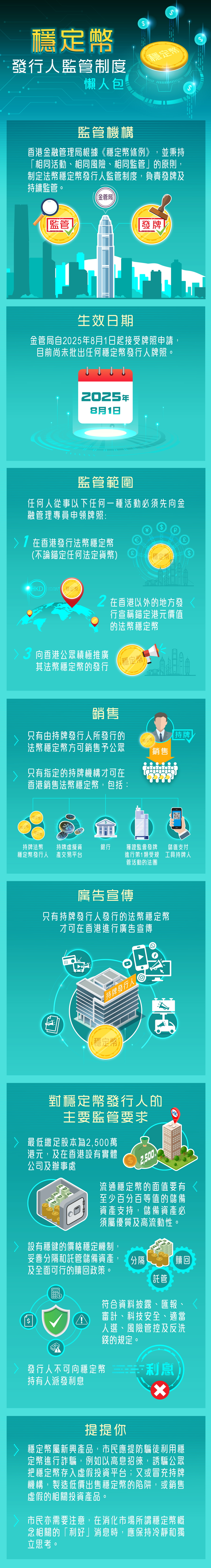 穩定幣是一種通過錨定某些資產(例如貨幣、黃金)維持相對穩定價值的虛擬資產。現時市場上大部分穩定幣以法定貨幣為錨定資產,稱為「法幣穩定幣」,並逐漸與傳統金融及經濟活動產生密切關連。立法會於2025年5月通過《穩定幣條例》,為香港引入法幣穩定幣發行人監管制度,保障使用者權益及金融穩定,同時推動金融創新。大家可以透過以下懶人包,了解監管制度的要點。